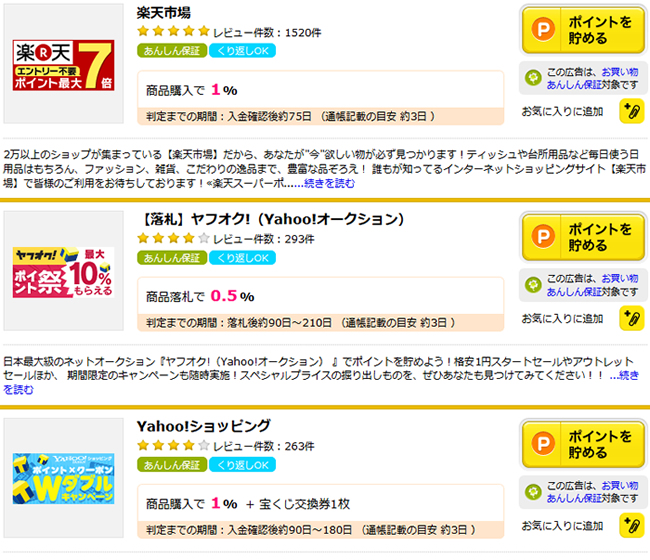 個人的な一押しは「ハピタス」というサイトです。もちろん、登録は無料です。ためたポイントは300円からキャッシュバックしてもらうことが可能です。